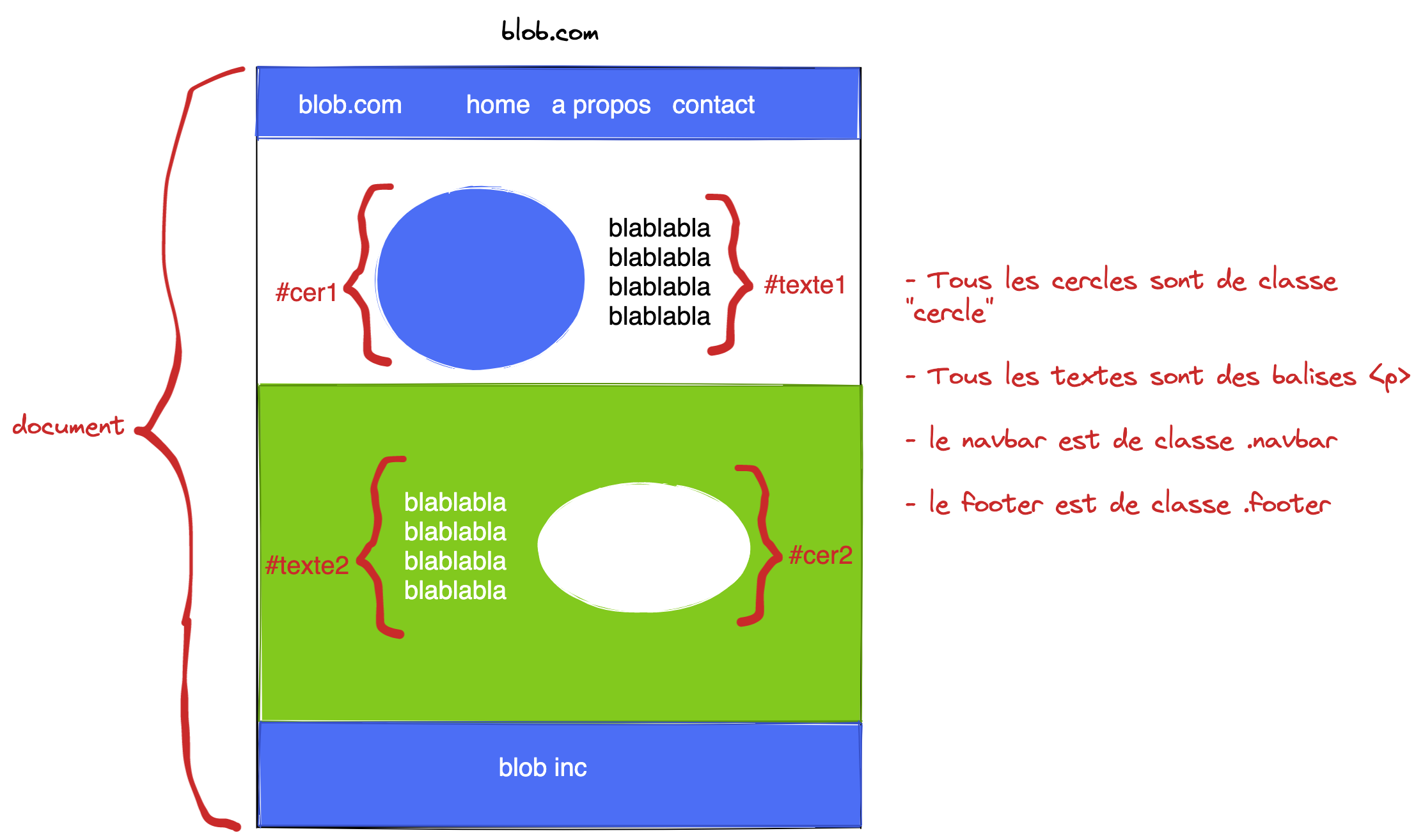 document.getElementById("tonIDici") (SANS le #)document.getElementsByClassName("taClasseIci") (SANS le .) (retourne PLUSIEURS)document.getElementsByTagName("taBaliseHTMLCommeDivOuH2") (sans les <>) (retourne PLUSIEURS)Vraiment important de comprendre qu'est-ce qui arrive quand on reçoit l'objet!!