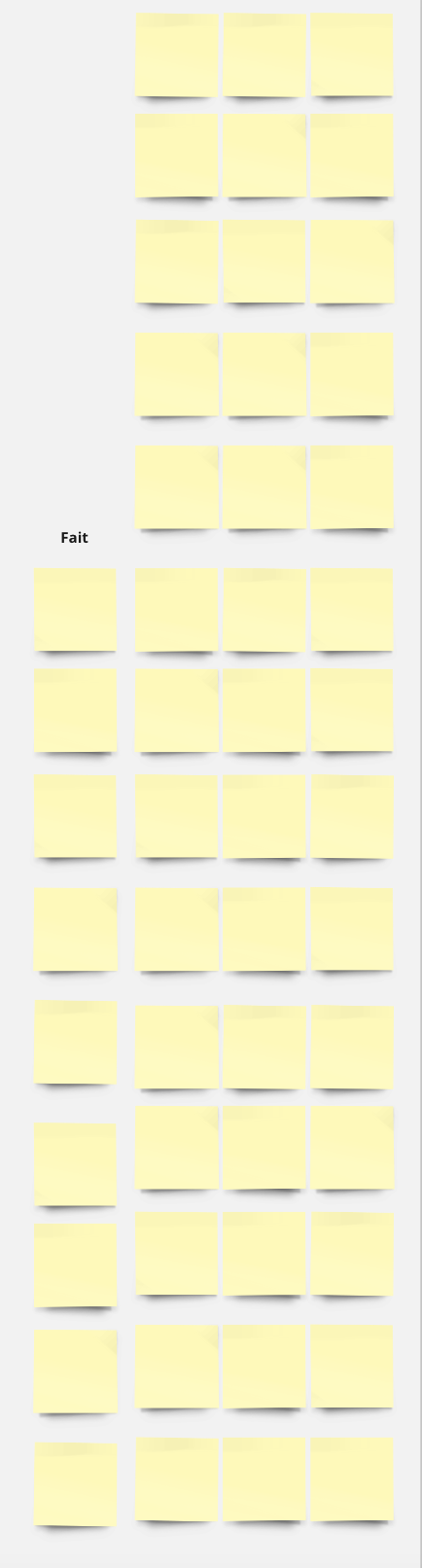 Une fois que toute l'équipe a fini les mini-tâches (tous les post-its sont dans "fait"), vous passez à la grande tâche suivante. Assurez-vous de ne pas effacer vos post-its des tâches précédentes de la colonne "fait". Je veux voir le progrès de toutes vos tâches faite Si vous n'avez pas de place vers le bas parce que vous avez beaucoup de post-its, vous pouvez faire plusieurs colonnes de post-its pour la section "fait" de la manière suivante: