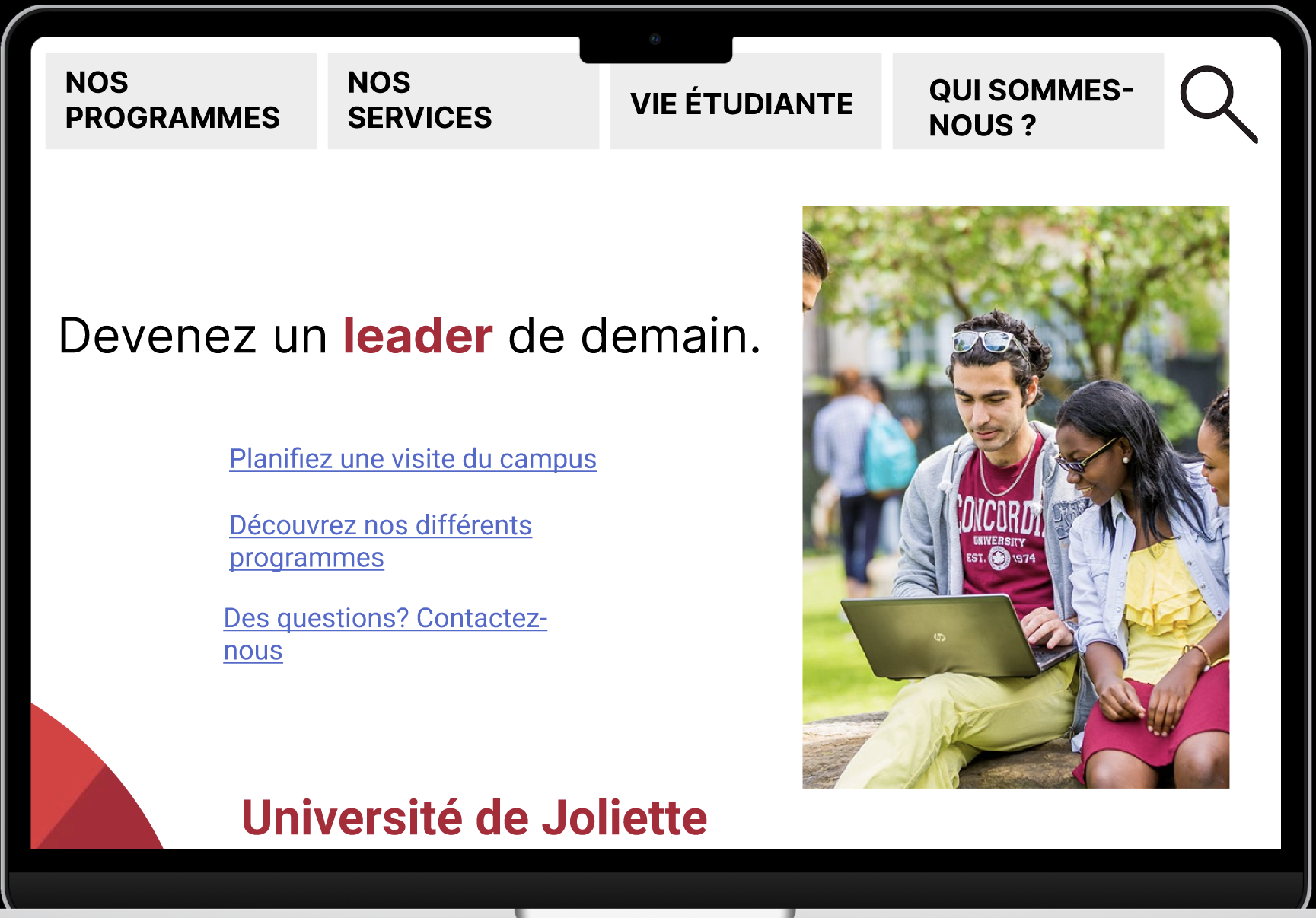 Exemple : "Gabriel est un étudiant en sciences naturelles au cégep de 18 ans vivant à Joliette. Étant un mordu d'informatique, il recherche sa future université afin de poursuivre un bacc en informatique. Il s'informe donc sur les différents sites d'admission des universités du Québec."